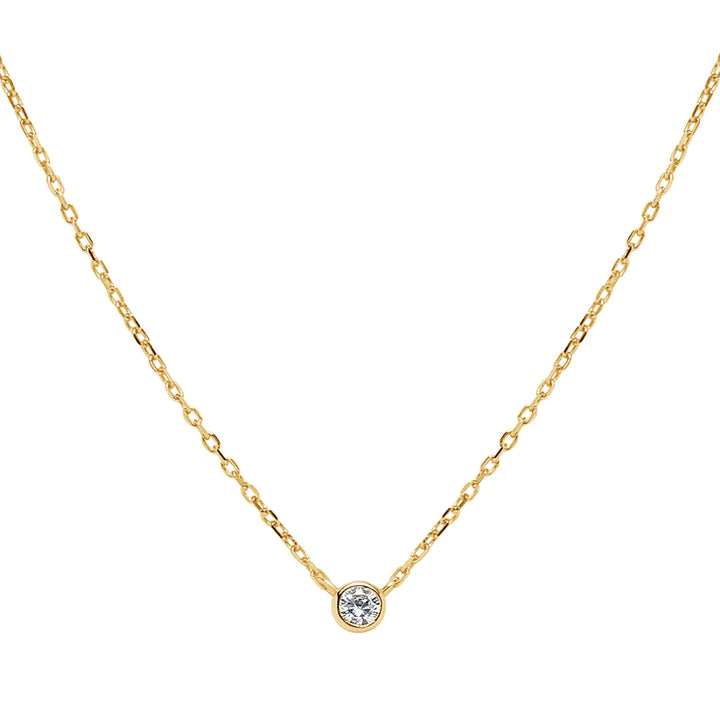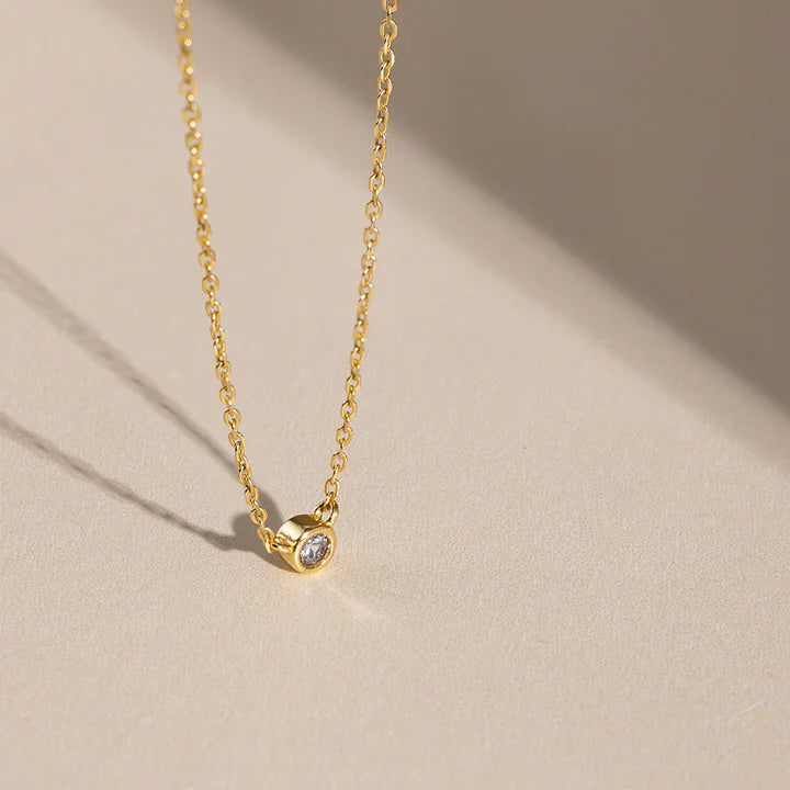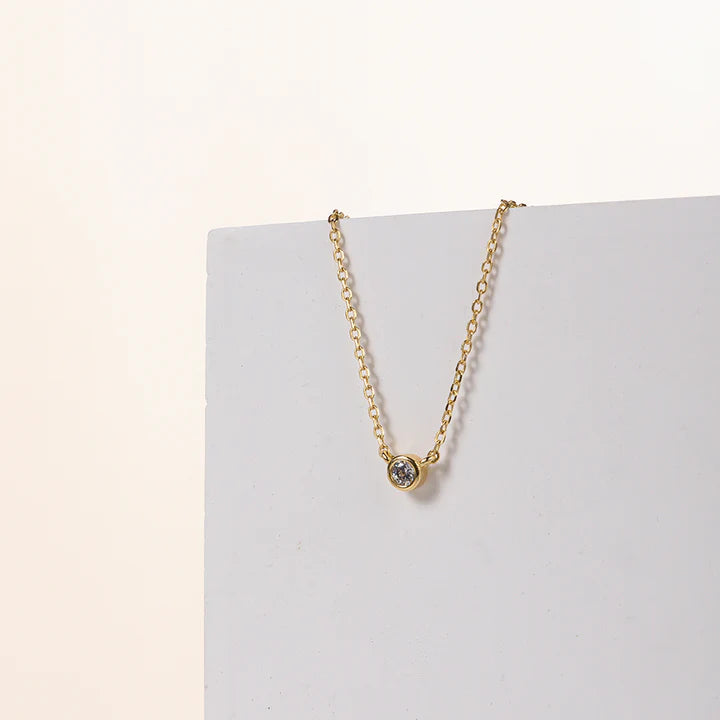 The perfect addition to your jewelry collection: the Aine Zirconia Minimalist Necklace. Crafted with impeccable attention to detail, this necklace features an exquisite cubic zirconia bezel that will sparkle with every movement. Delicate yet eye-catching, this necklace is perfect for adding an elegant detail to any outfit.