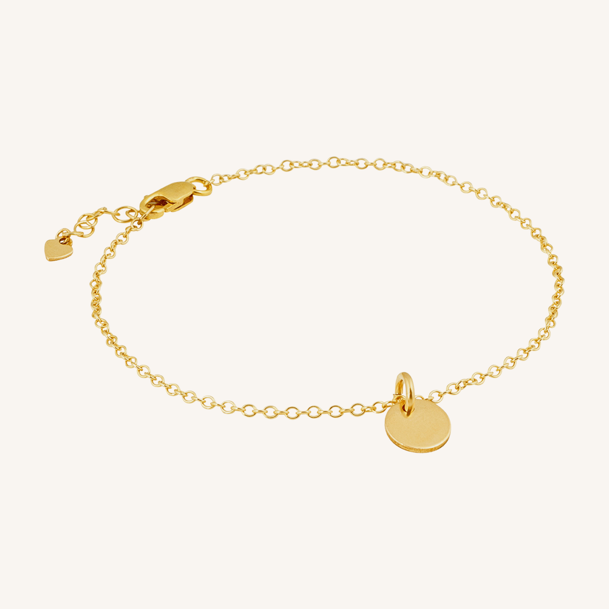 Engravable Circle Charm Bracelet in Gold. This delicate cable chain bracelet features a stunning circle charm that can be customised with your own engraving, making it a perfect unique accessory for any occasion or a special gift for a loved one.