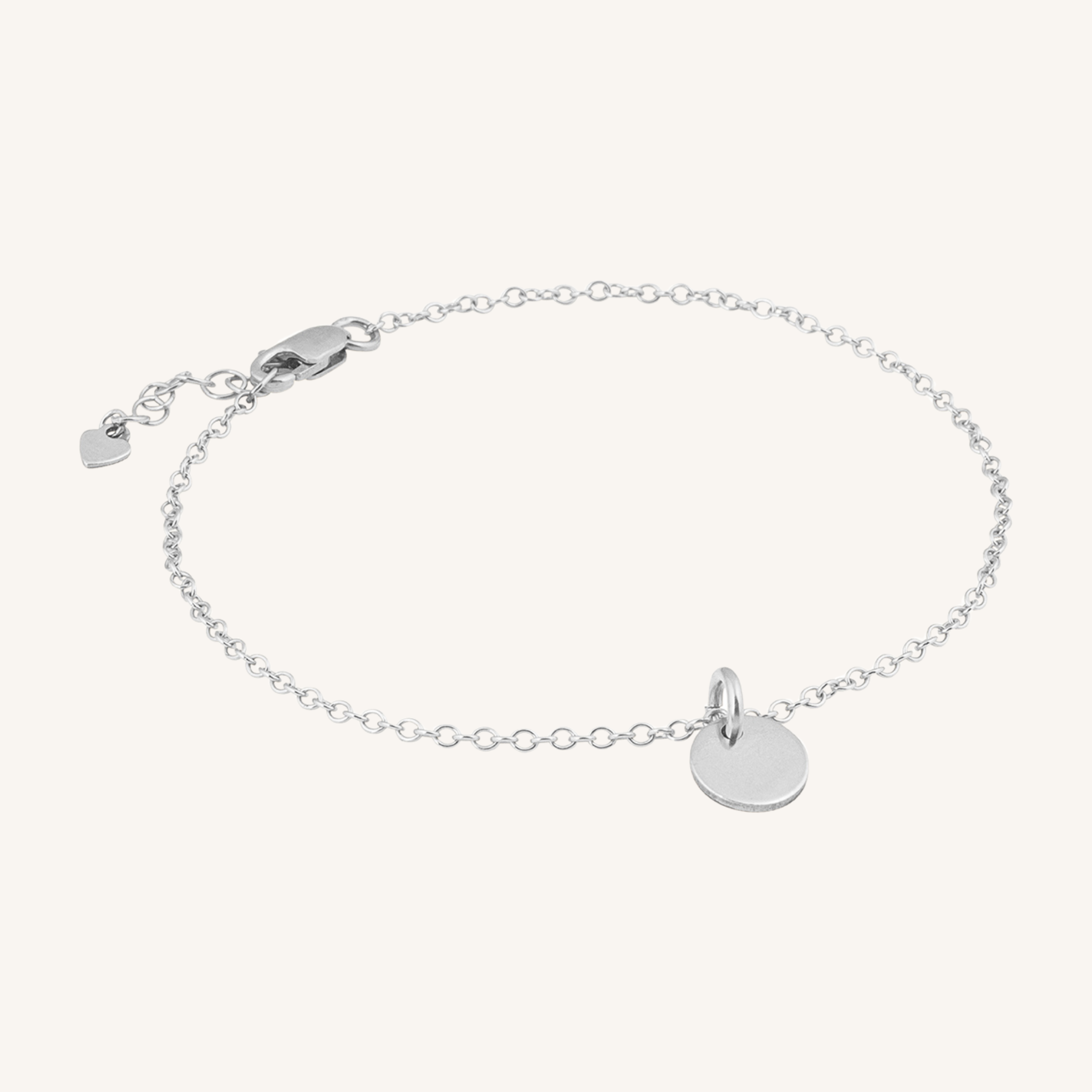 Engravable Circle Charm Bracelet in Silver. This delicate cable chain bracelet features a stunning circle charm that can be customised with your own engraving, making it a perfect unique accessory for any occasion or a special gift for a loved one.