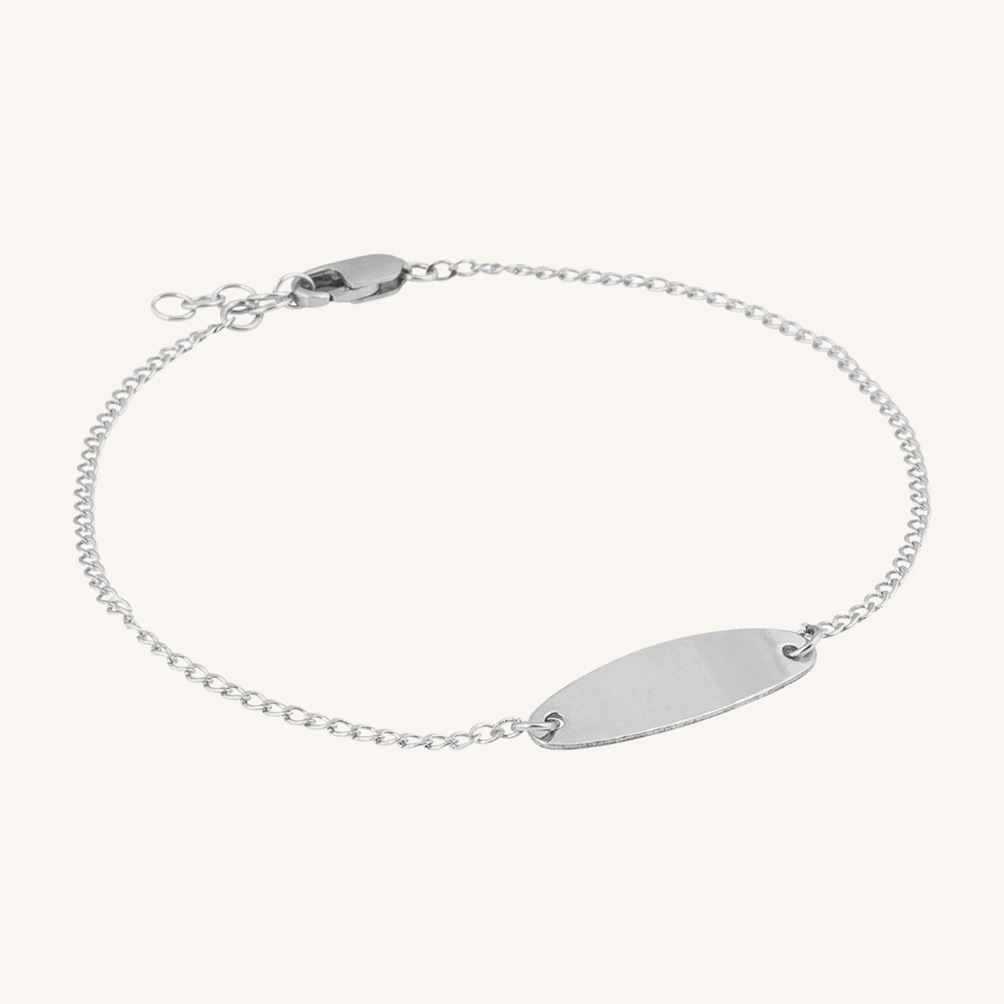 Engravable Oval Charm Bracelet in Silver. This delicate cable chain bracelet features a stunning connecting oval charm that can be customised with your own engraving, making it a perfect unique accessory for any occasion or a special gift for a loved one.