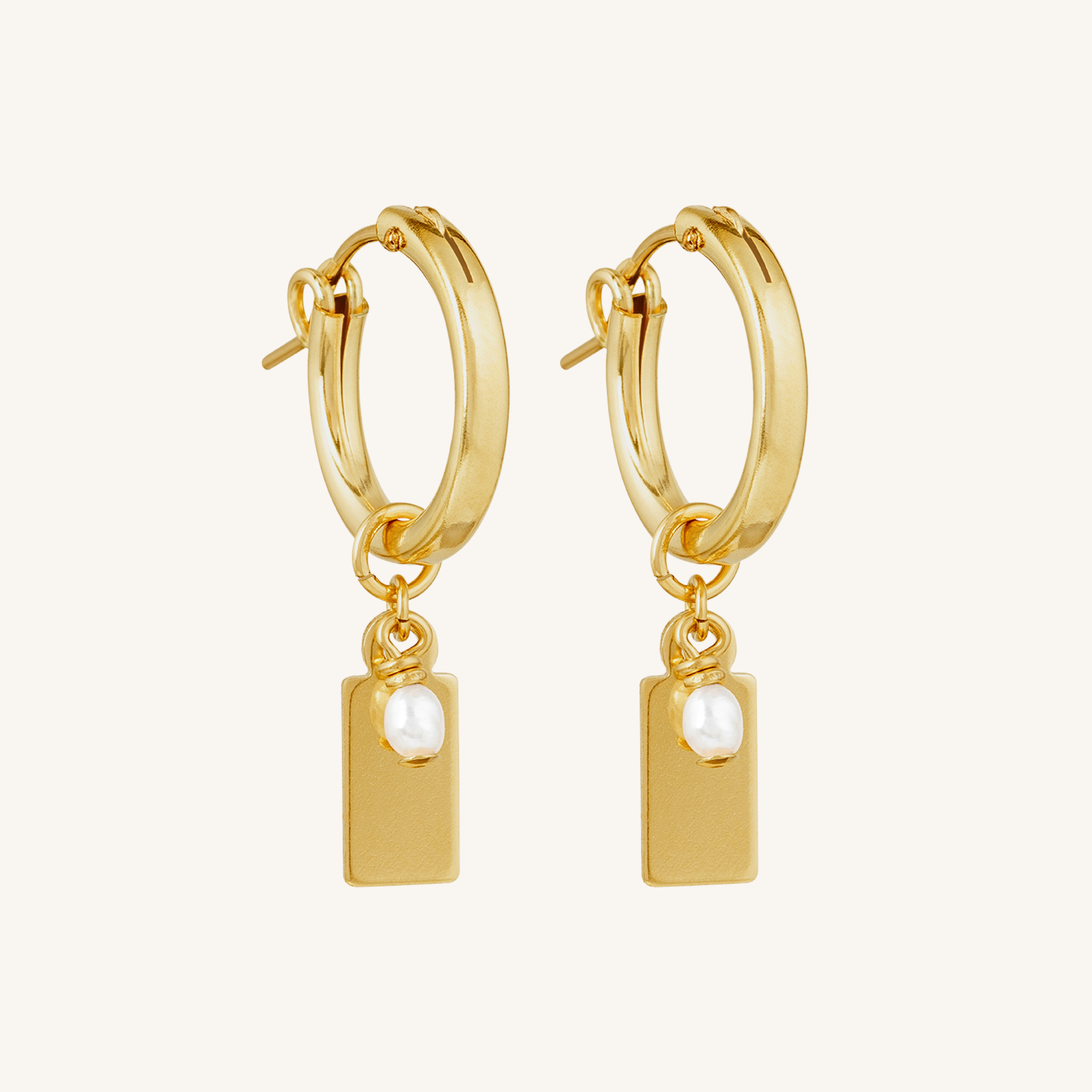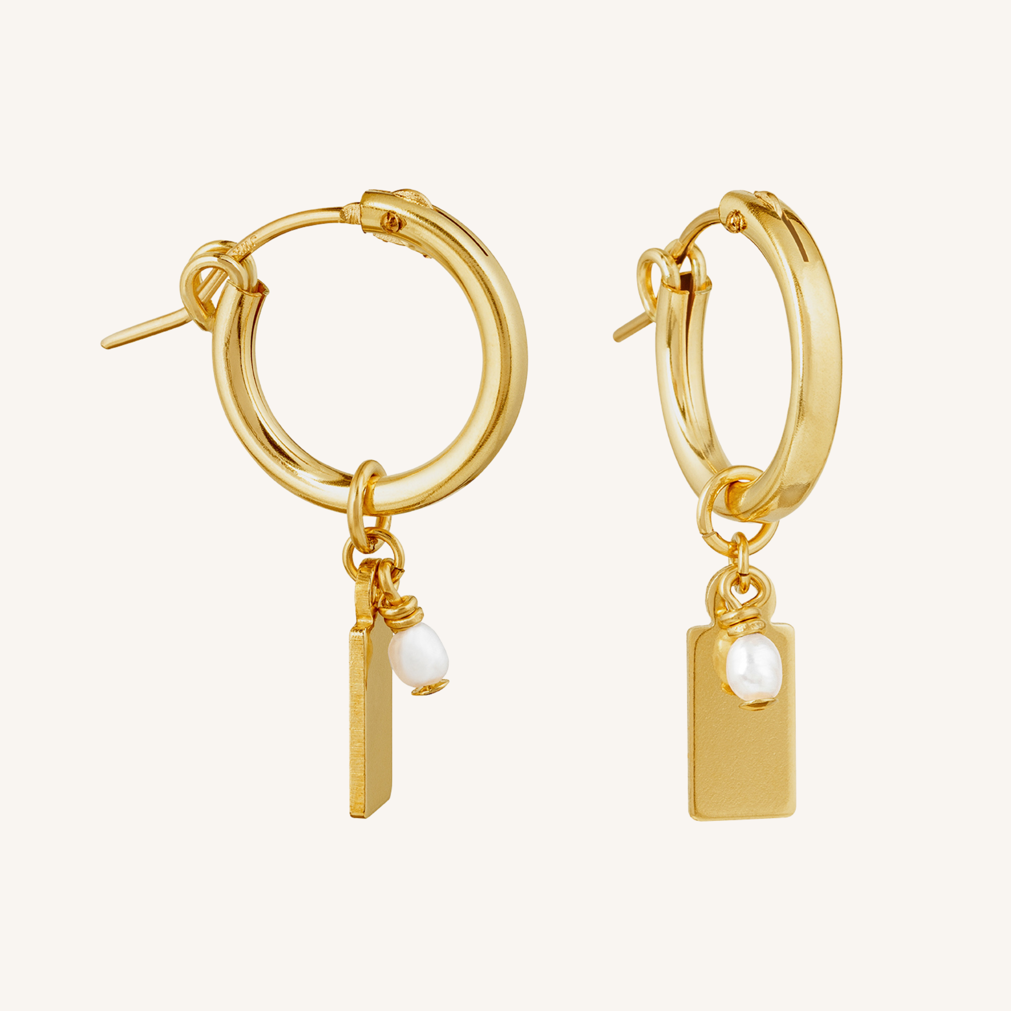 Engravable Rectangle Charm Hoops with Pearl in gold. Create your very own unique pair of earrings by adding any letters or numbers to the rectangle charm. These earrings are a perfect addition to your earring stack or a thoughtful gift for a friend