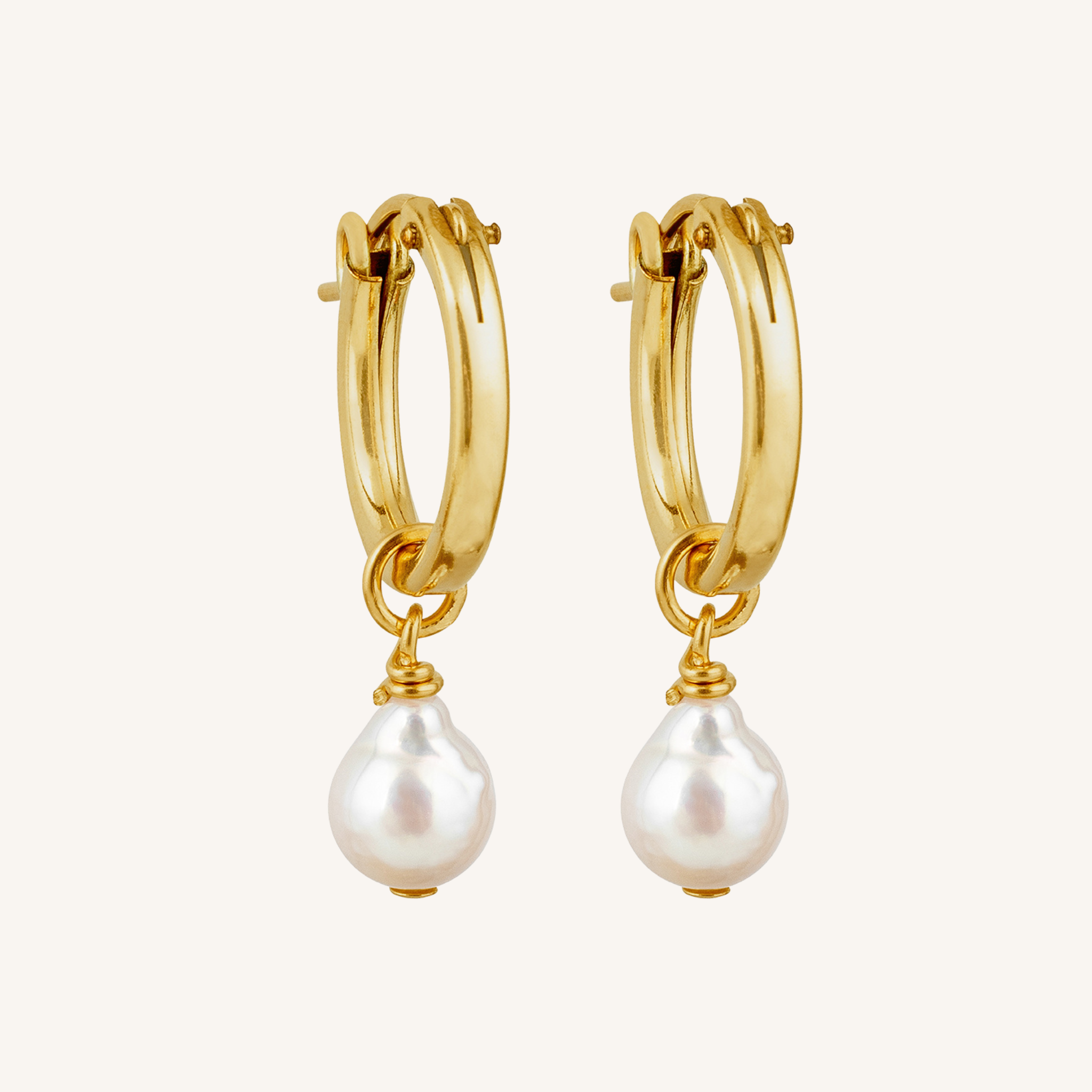 Complete your outfit with these elegant Mimi Pearl Hoops in gold. Featuring a stunning freshwater pearl, these hoops add a touch of luxury to any look.