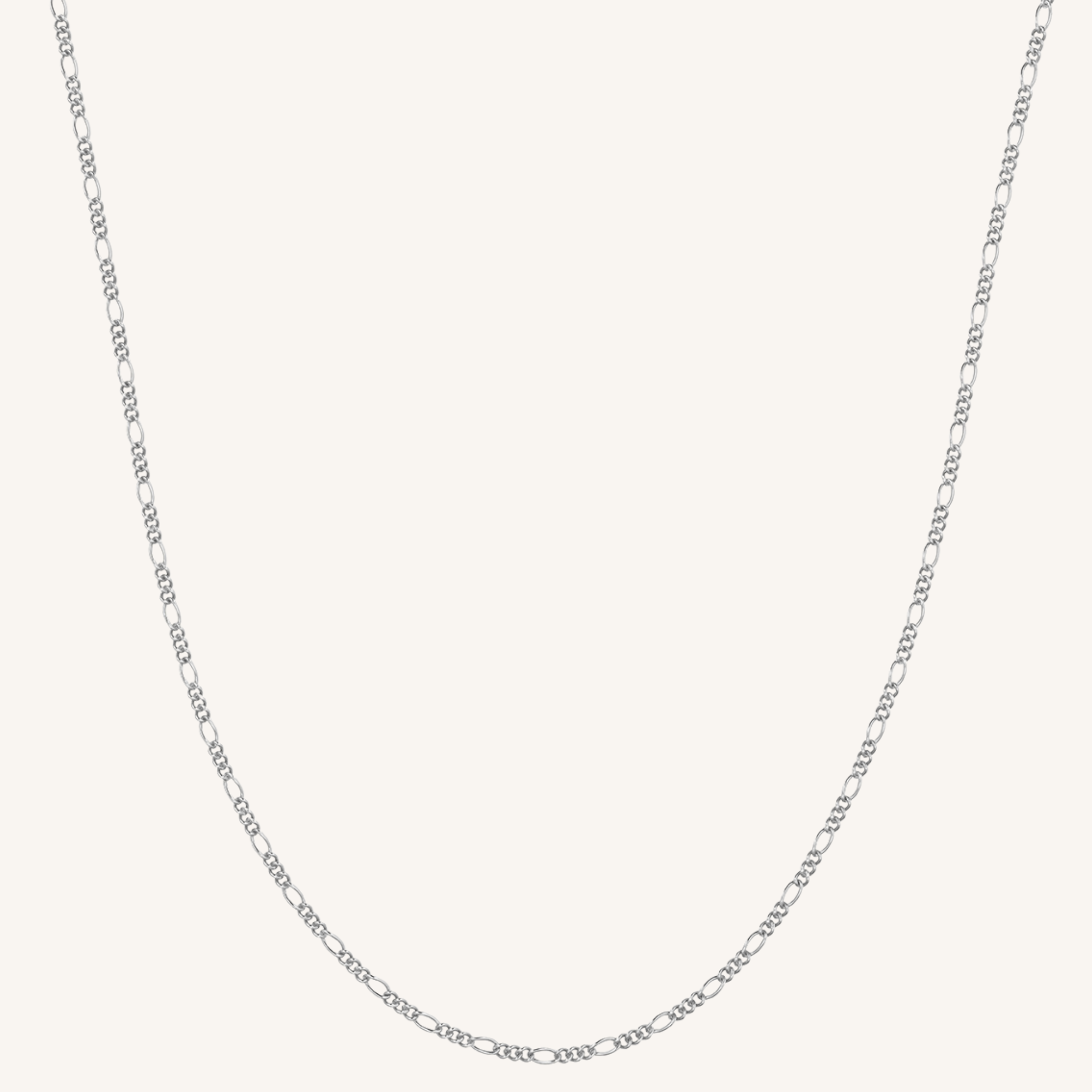 Introducing the Rhea Figaro Necklace in Silver. Crafted from 925 sterling silver material, this necklace boasts elongated links with three smaller links for a delicate and refined look.