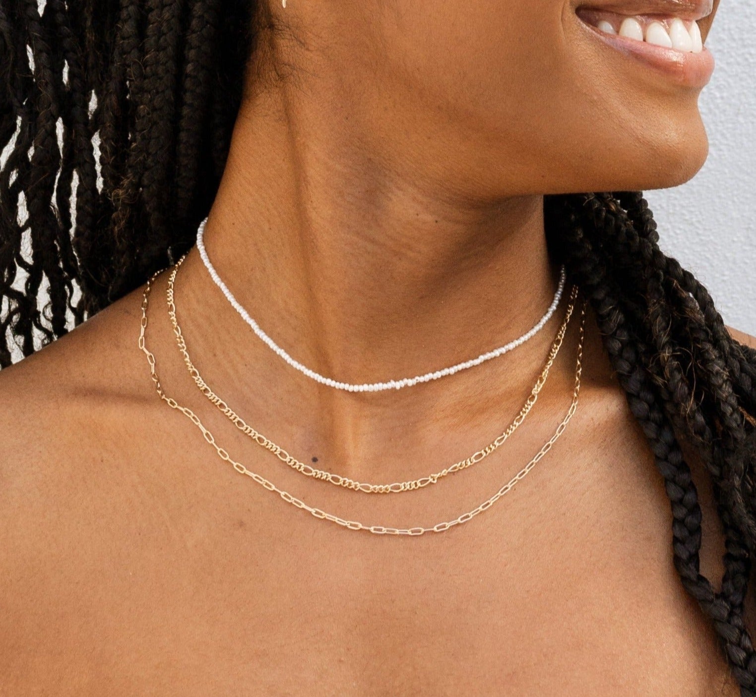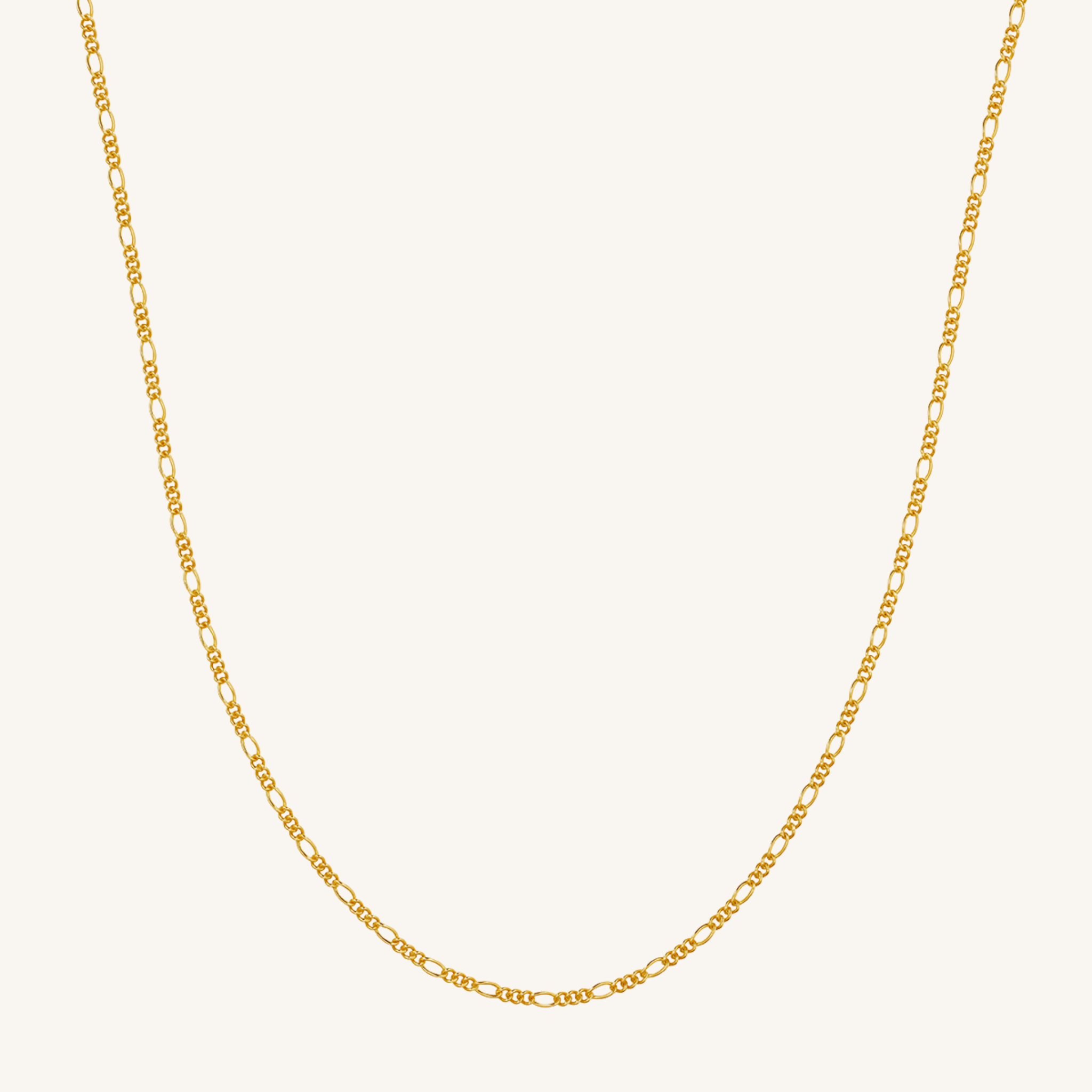 Introducing the Rhea Figaro Necklace in Gold. Crafted from 14k gold-filled material, this necklace boasts elongated links with three smaller links for a delicate and refined look.
