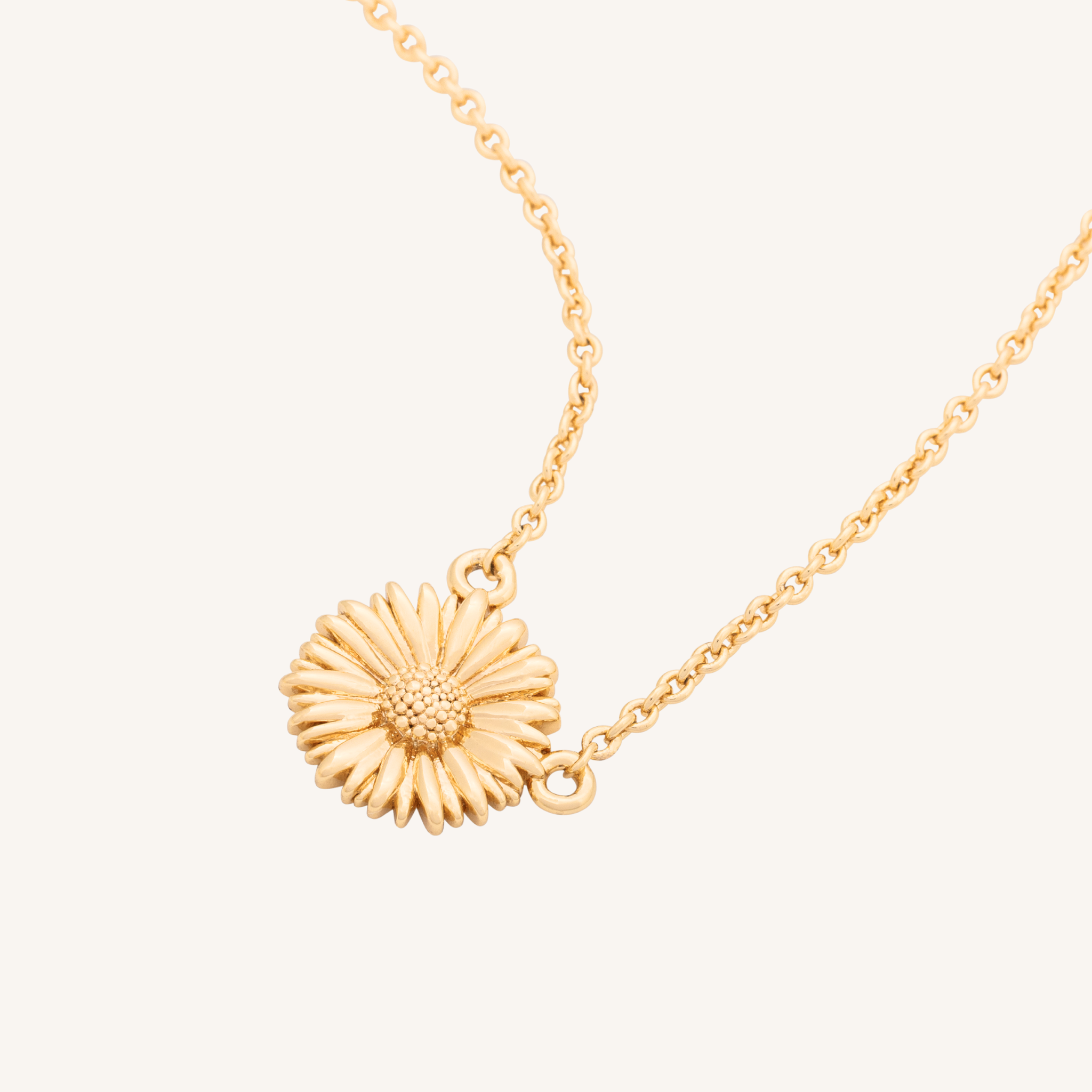 Gold necklace displayed on a purple flower with a light gray background