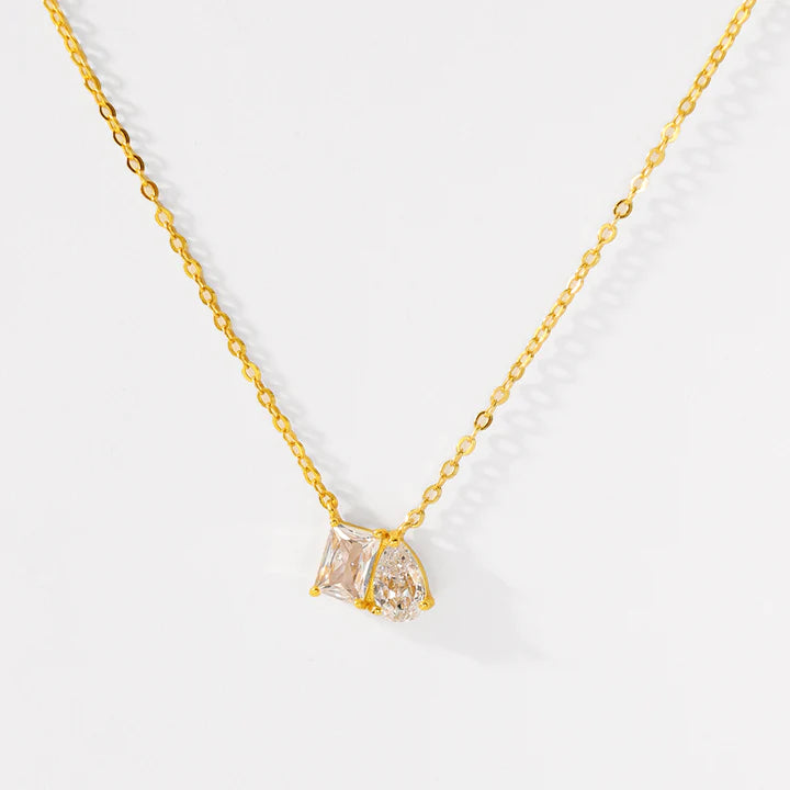 Introducing the Toi Et Moi Necklace in Gold: a sophisticated, luxurious jewelry piece featuring a unique combination of a teardrop and square arranged on a delicate gold necklace.
