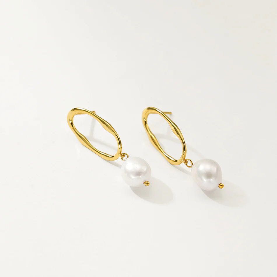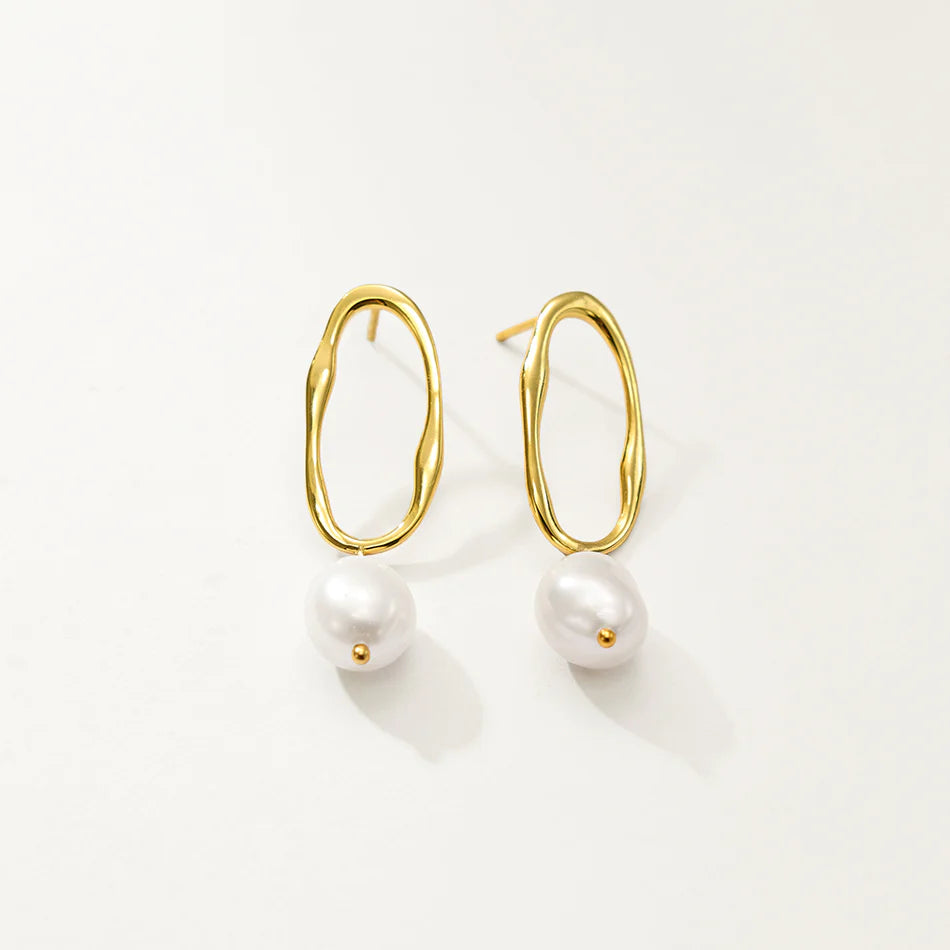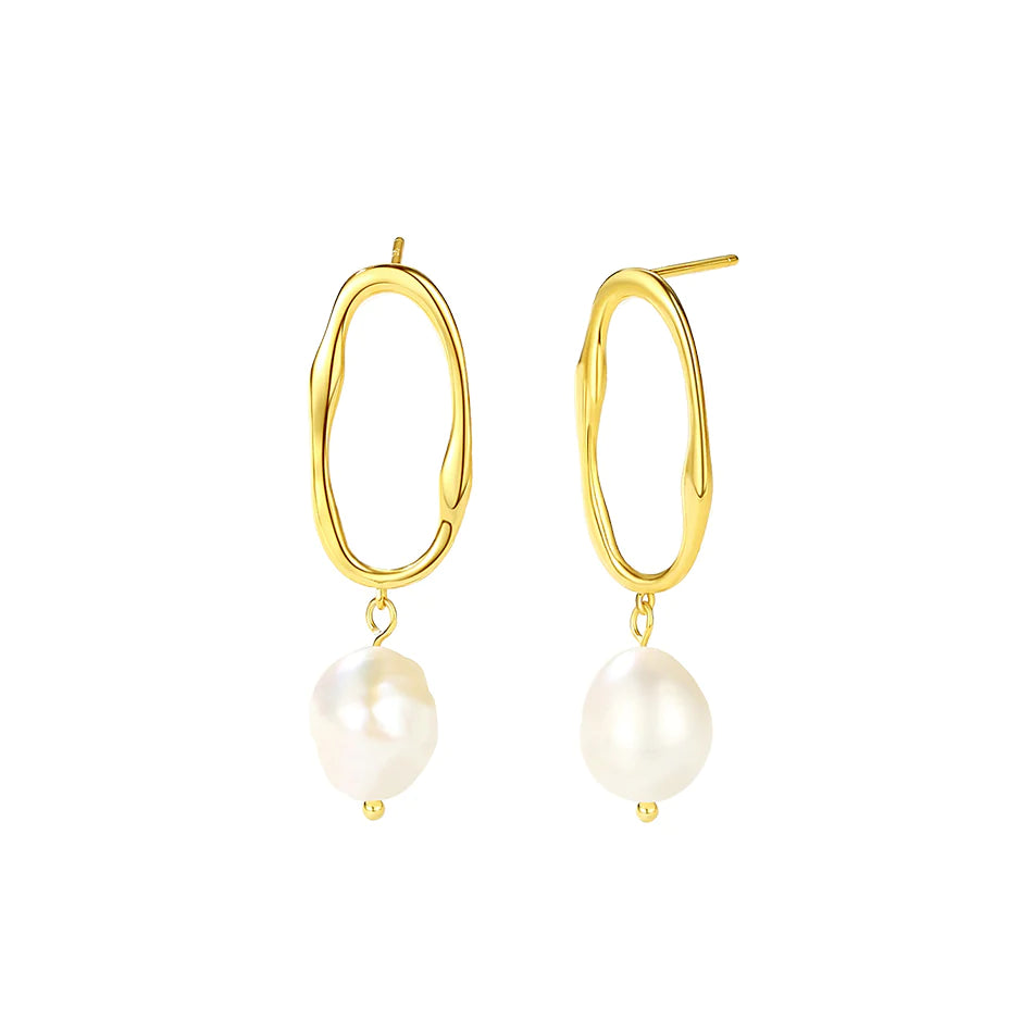Handcrafted with exquisite detail, these earrings feature a molten gold oval with a delicate freshwater pearl drop, making for an eye-catching accessory that's sure to brighten your look.